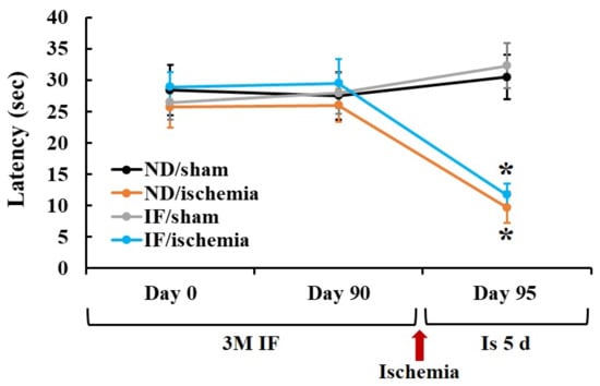 Short-term memory tests using passive avoidance test in the ND/sham, IF/sham, ND/ischemia and IF/ischemia groups. The latency time before and after 3-month IF in both sham groups is not altered. In addition, there is no difference in latency time at 5 days post-ischemia between the ND/ischemia and IF/ischemia groups (n = 7 per group; * p < 0.05, vs. ND/sham group by post hoc Tukey’s test). Bars indicate means ± SEM. IF, intermittent fasting; ND, normal diet.