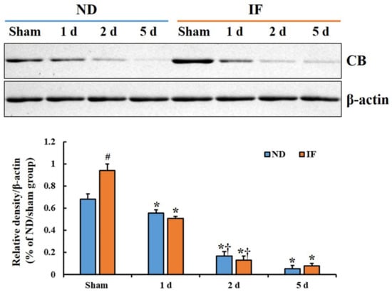 Representative blot images and quantitative analysis of CB protein in the hippocampal CA1 region of the ND/sham, IF/sham, ND/ischemia and IF/ischemia groups at sham, 1 day, 2 days, and 5 days after ischemia (n = 5 at each point in time in each group, * p < 0.05 vs. sham group, # p < 0.05 vs. corresponding time point group of ND group, † p < 0.05 vs. pre-time point group of each group by post hoc Tukey’s test). Bars indicate means ± SEM. IF, intermittent fasting; ND, normal diet.