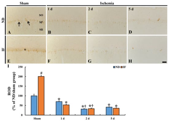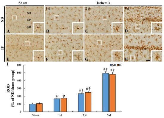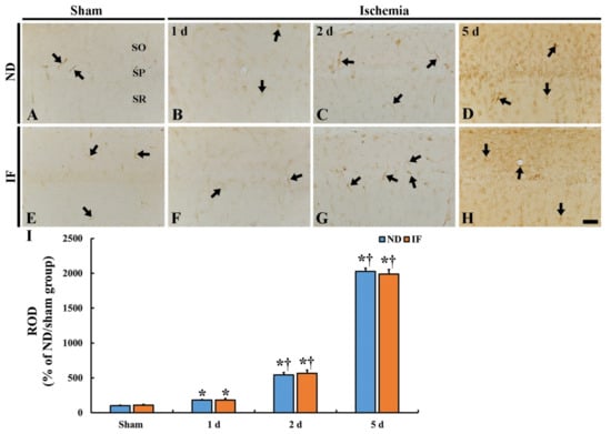 Immunohistochemical staining for ionized calcium-binding adapter molecule 1 (Iba-1), a marker for microglia, was done to observe microglia activation in the CA1 region in the ND and IF groups with or without ischemia (Figure 6). In the ND/sham (Figure 6A) and IF/sham (Figure 6E) groups, there was no difference in the distribution of Iba-1 immunoreactive microglia between the two groups. Namely, they were evenly scattered in all layers of the CA1 region and identified as a resting form of microglia (Figure 6A,E). After ischemia in the two groups, the change patterns of the Iba-1 immunoreactive microglia were similar (Figure 6B–D,F–H). With time after ischemia, their cytoplasm was enlarged with thickened processes as the active form. In addition, no significant difference in the ROD of Iba-1 immunoreactivity was observed between the two groups. The ROD in the ND/ischemia group was gradually increased (167% at 1 day, 231% at 2 days, and 494% at 5 days compared to that of the ND/sham group) (Figure 6I). In the IF/ischemia group, the ROD was 175% at 1 day, 248% at 2 days, and 481% at 5 days, compared to that of the ND/sham group (Figure 6I).