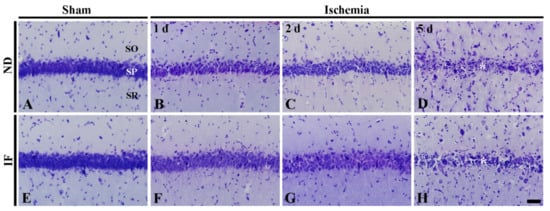 As we previously described [], all gerbils were anesthetized with a mixture of 2.5% isoflurane from Baxtor (Deerfield, IL, USA) in 67% nitrous oxide and 33% oxygen. Under anesthesia, the gerbils received an incision on the neck to find both common carotid arteries, and the arteries were occluded by non-traumatic aneurysm clips for 5 min and then re-perfused. The body temperature of the gerbils was controlled at normothermia (37 ± 0.5 °C) using a thermometric blanket during the surgery, monitoring the temperature using a rectal temperature probe (TR-100) (Fine Science Tools, Foster City, CA, USA). All animals were fed ND after the surgical procedure. The gerbils included in the sham group underwent identical surgical procedures without the ligation of common carotid arteries. Thereafter, the gerbils were kept in thermal incubators (temperature, 23 °C; humidity, 60%) to maintain body temperature at the normothermic level until they were euthanized. Until the gerbils were sacrificed, they were continually fed ND or IF.