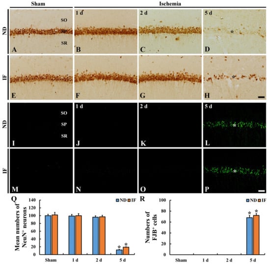 Neuronal nuclei antigen (NeuN) immunohistochemistry (A–H) and fluoro-Jade B (FJB) fluorescence staining (I–P) in the CA1 region of the ND and IF groups at sham (A,E,I,M), 1 day (B,F,J,N), 2 days (C,G,K,O) and 5 days (D,H,L,P) after ischemia. The NeuN immunoreactive pyramidal neurons in both of the groups show immunoreactivity until 2 days post-ischemia; however, at 5 days post-ischemia, few NeuN immunoreactive pyramidal neurons (asterisk) are shown in both of the groups. In addition, in both of the groups, numerous FJB-positive neurons are shown in the stratum pyramidale (SP) at 5 days post-ischemia. Scale bar = 50 µm. (Q,R) Mean numbers of NeuN immunoreactive (Q) and FJB-positive (R) cells in 250 μm2 at the center of the CA1 region (n = 7 in each group, * p < 0.05 vs. ND/sham group by post hoc Tukey’s test). Bars indicate the means ± SEM. IF, intermittent fasting; ND, normal diet; SO, stratum oriens; SR, stratum radiatum.
