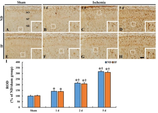 Immunohistochemical staining for glial fibrillary acidic protein (GFAP), a marker for astrocytes, was carried out in order to investigate the activation of astrocytes in the CA1 region in the ND and IF groups with or without ischemia (Figure 7). GFAP immunoreactive astrocytes, as the resting form, had fine cellular processes in both ND/sham (Figure 7A) and IF/sham groups (Figure 7E). On the other hand, after ischemia, the pattern of changes in the GFAP immunoreactive astrocytes was similar between the ND and IF groups (Figure 7B–D,F–H). With time after ischemia, GFAP immunoreactive astrocytes became hypertrophied, and their cellular processes became thickened in both of the ND and IF/ischemia groups (Figure 7B–D,F–H). ROD in the ND/ischemia group was gradually increased (142% at 1 day, 214% at 2 days, and 316% at 5 days compared to that of the ND/sham group) after ischemia (Figure 7I). In the IF/ischemia group, the ROD was 140% at 1 day, 207% at 2 days, and 309% at 5 days compared to that of the ND/sham group (Figure 7I).