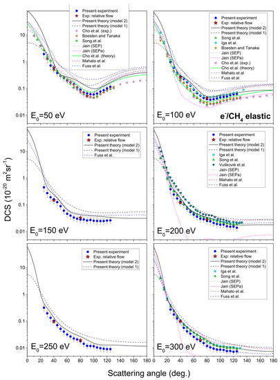 - Shyn, T.W.; Cravens, T.E. Angular distribution of electrons elastically scattered from CH4. J. Phys. B 1990, 23, 293–300. [Google Scholar] [CrossRef]