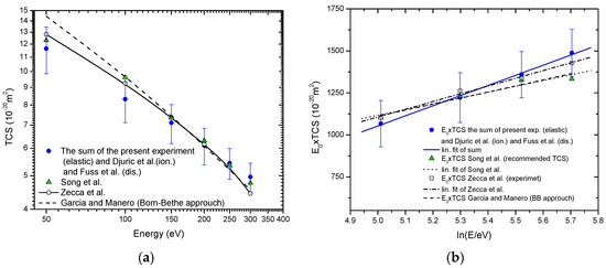 If total cross-section (TCS) we calculate as the sum of our measured ICSs, and ionization cross-sections obtained by Djurić et al. [50] plus the recommended neutral dissociation cross-sections by Fuss et al. [34], the TCS values obtained in such way agree well, within experimental uncertainties, with previously published experimental values by Zecca et al. [51] and recommended values by Song et al. [17]. Furthermore, for electron energies greater than 150 eV present TCS well agree with the semiempirical TCS by García and Manero [52] extrapolated in the interval energies of this paper. Total cross-sections for electron-methane collision in the energy range from 45 eV to 300 eV are contrasted in Figure 3a, while the corresponding Fano-Bethe plot is shown in Figure 3b. For electron energies from 150 eV to 300 eV Bethe plot of present TCS, References [17,51] and extrapolated semiempirical TCS García and Manero [52], agree within the limits of experimental uncertainties. This, under the given conditions, suggests that Born-Bethe approximation is valid in the electron energy range from 150 eV to 300 eV.
