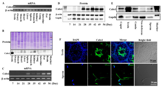 The distribution of mouse Cabs1 and AntiCabs1 in various tissues was detected via RT-PCR. The results showed that Cabs1 and AntiCabs1 were exclusively expressed in mouse testis (Figure 1A and Figure S1). Consistent with mRNA expression, the Cabs1 protein was also specifically expressed in the testis (Figure 1B). The expression levels of both the Cabs1 mRNA and protein sharply increased in postnatal four-week-old testes, during the elongating spermatid stage, and the expression was detected from the elongated spermatid (postnatal day 28) to adult stages (Figure 1C,D). Cabs1 was also detected in the caput and cauda epididymis, vas deferens, and mature sperm (Figure 1E). An immunofluorescence analysis showed that Cabs1 was mainly located in elongating spermatids and the acrosome and principal piece in mature sperm (Figure 1F). Taken together, these results demonstrated that Cabs1 expression was spermatid-specific and may be important for spermiogenesis and sperm function regulation.