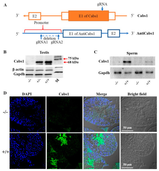 Generation of calcium-binding protein spermatid-associated 1 (Cabs1) and antisense of the Cabs1 gene (AntiCabs1) knockout (KO) mice. (A) A schematic illustration of the Clustered Regularly Interspaced Short Palindromic Repeat (CRISPR)-Cas9-generated Cabs1 and AntiCabs1 KO mice. (B,C) Validation of the Cabs1 KO mouse model by Western blot analysis. The loss of the Cabs1 protein expression in the testis and sperm confirmed the Cabs1 KO strategy. (D) Confirmation of the Cabs1 KO mouse model by immunofluorescence on testicular tissue.