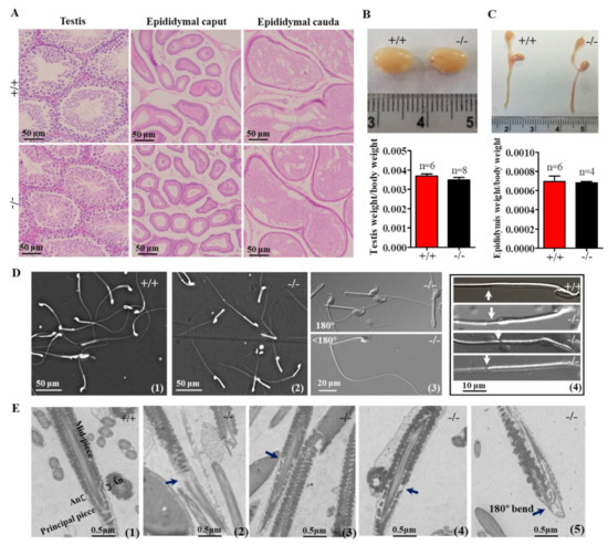 Spermatogenesis is a highly conserved cyclic process in which spermatogonial stem cells generate mature spermatozoa. It is precisely controlled by many genes and intrinsic signals. Many endogenous or exogenous factors may cause abnormal spermatogenesis and male infertility [1,2]. Spermiogenesis is the terminal phase of spermatogenesis and consists of the differentiation of newly formed spermatids into spermatozoa. During spermiogenesis, round spermatids undergo a drastic restructuring program, including elongation, condensation of the nucleus, and the formation of sperm acrosome and tail. Understanding the intricate mechanisms that control spermiogenesis has important implications for human health and reproduction. Additionally, further plasticity and maturation of sperm in the epididymis are essential for male reproduction. Although extensive studies suggest that these processes are elaborately regulated by many male germ cell-specific genes [3,4,5,6], the underlying mechanisms and novel pathogenic genes need to be further addressed. The identification of functional genes will provide novel avenues for genetic diagnosis and new insights into human infertility.