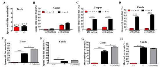 The site of the onset of structural defects of sperm flagella in calcium-binding protein spermatid-associated 1 knockout (Cabs1−/−) mice. (A–C) Enumeration of angulated spermatozoa in the three distinct regions of the epididymis indicated that the structural defect of bent tails occurred during the transit of sperm through the Cabs1−/− epididymis. Sperm with bent tails were counted under 430 and 310-mOsm high-salt buffers. (D) The percentage of sperm with a thin annulus in the testes in WT Cabs1−/− mice. (E,F) The percentage of sperm with a thin annulus in the caput and cauda of epididymis were calculated in WT and fertile and infertile Cabs1−/− mice. (G,H) Total abnormal sperm rates in the caput and cauda of the epididymis were calculated in WT and fertile and infertile Cabs1−/− mice. Data in bar graphs are presented as mean ± SE. * p < 0.05, ** p < 0.01, and *** p < 0.001.