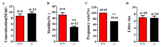 Although Cabs1−/− mice had normal sperm numbers, the sperm total motility was significantly lower than WT mice (Figure 5A,B). Fertility tests by breeding WT and Cabs1−/− adult males with WT adult females over a six-month period revealed that some Cabs1−/− male mice (~30%) were sterile (Figure 5C). Interestingly, for fertile Cabs1−/− male mice, their litter sizes were equivalent to those of WT mice (Figure 5D).