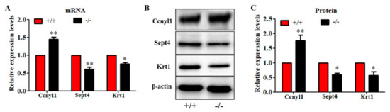 Genetic loss of calcium-binding protein spermatid-associated 1 (Cabs1) altered the expression levels of cytoskeleton-related proteins in sperm. (A) mRNA, (B,C) protein expression levels of cyclin Y-like 1 (Ccnyl1), septin 4 (Sept4), and Krt1 in WT and KO mice. Total RNA was isolated from sperm using a RNAiso Plus kit, and qPCR was performed to detect mRNA expression levels. β-actin gene expression was used as a loading control. Equal amounts of total protein extracted from sperm of Cabs1−/− and wild-type mice were subjected to SDS-PAGE and immunoblotting with antibodies directed against Ccnyl1, Sept4, and Krt1 and β-actin. (B) Blots are representative of three independent experiments, and the combined data are presented in histograms (C). Data in bar graphs are presented as mean ± SE. * p < 0.05 and ** p < 0.01 versus WT.
