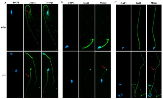 To further study the underlying mechanisms that induced the sperm malformation in Cabs1 KO mice, we investigated the expression of cytoskeleton-related proteins. Cyclin Y-like 1 (Ccnyl1) and septin 4 (Sept4) are flagella assembly-related proteins whose defects lead to similar phenotypes in sperm morphology. The Ccnyl1 mRNA level was elevated; however, the Sept4 and Krt1 mRNA levels were lowered in Cabs1 KO mouse sperm (Figure 6A). Similarly, a Western blot analysis revealed that the expression of Krt1 and Sept4 were significantly decreased, but Ccnyl1 was increased, in mature sperm of Cabs1−/− compared with WT mice (Figure 6B,C). The immunofluorescence results further confirmed that the expression levels of Ccnyl1, Sept4, and Krt1 were changed (Figure 7). In addition, their expression patterns or locations in sperm of Cabs1−/− mice were also disturbed (Figure 7, red arrows). These results suggested that the genetic loss of Cabs1 impaired normal sperm formation by disturbing cytoskeleton-related protein expression essential for normal flagella assembly.
