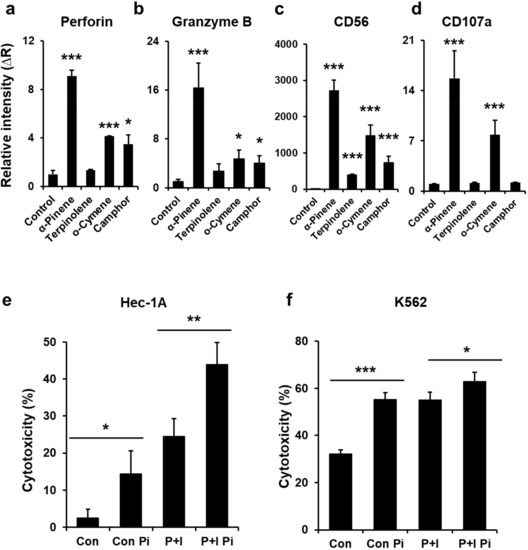 Phytoncides increase natural killer (NK) cell activation and cytotoxicity in NK-92mi cells. Human NK-92mi cells were activated by incubation with phorbol 12-myristate 13-acetate (PMA) and ionomycin for 6 h after treatment with α-pinene, terpinolene, o-cymene and camphor at 100 μM. The expression levels of (a) perforin, (b) CD56, (c) granzyme B and (d) CD107a mRNA were analyzed with real-time PCR. The data are expressed as the mean ± SD of three independent experiments (* p < 0.05, *** p < 0.005). Human NK-92mi cells were incubated with target K562 cells or HEC-1A cells, which were prelabeled with calcein-AM for 4 h, as described. Calcein-AM released from K562 and HEC-1A target cells was measured by a fluorescence microplate reader. (e) NK-92mi cytotoxicity towards Hec-1A cells. (f) NK-92mi cytotoxicity towards K562 cells. Con: control, Con Pi: control with α-pinene treatment, P+I: PMA and ionomycin activation, P+I Pi: PMA and ionomycin activation with α-pinene treatment. Results are expressed as the mean ± SD of three independent experiments (* p < 0.05, ** p < 0.01, *** p < 0.005).