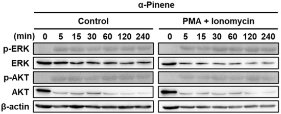 To determine whether the ERK/AKT pathway is involved in NK cell cytotoxicity in response to phytoncides [49], we performed immunoblot assays. α-Pinene treatment induced the activation of several ERK/AKT signaling molecules such as total ERK1/2, phospho-ERK1/2 (Thr202/Tyr204), AKT and phospho-AKT (Y312). The experiment was divided into a PMA and ionomycin-treated group and a control group. Cells were harvested at 5, 15, 30, 60, 120 and 240 min after α-pinene treatment to confirm the ERK and AKT pathway expression patterns over time. The emergence of ERK phosphorylation and AKT phosphorylation began around 5 min after α-pinene treatment (Figure 2). A similar time frame was manifested in PMA and ionomycin-activated NK-92mi cells. In the PMA and ionomycin treatment, the emergence of ERK phosphorylation and AKT phosphorylation occurred 5 min after treatment (Figure 2). Furthermore, to further confirm that α-pinene increases the ERK/AKT signaling pathway in NK cells, we conducted an immunoblot assay using mouse splenic NK cells. As a result, similarly to NK-92mi cells, it was found that α-pinene causes an increase in AKT phosphorylation in mouse splenic cells (Figure A1). However, α-pinene did not induce ERK phosphorylation, implying the presence of a cell- or model-type dependence on the ERK/AKT pathway for the response. α-Pinene enhanced the expression of signaling molecules in ERK and AKT pathway signaling, indicating that α-pinene activates NK cells through ERK and AKT signaling. In addition, we performed NK cytotoxicity toward K562 using α-pinene in combination with ERK and AKT inhibitors. As a result, it was confirmed that the NK cytotoxicity increased by α-pinene was reduced by ERK and AKT inhibitors (Figure A2).