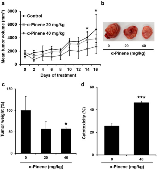 α-Pinene, one type of monoterpene, has been previously studied in various cancer cases. Most studies have been carried out with the monoterpene being directly delivered into cells or tumors transplanted in mice. However, in our experiment, cancer cells and tumor allografts were not directly treated with α-pinene. Instead, we measured immune cell activity and observed that human and mouse splenic NK cell cytotoxicity increased with α-pinene treatment (Figure 1b,c and Figure 3d). These results indicate that α-pinene has an indirect anticancer effect by boosting NK cell cytotoxicity.
