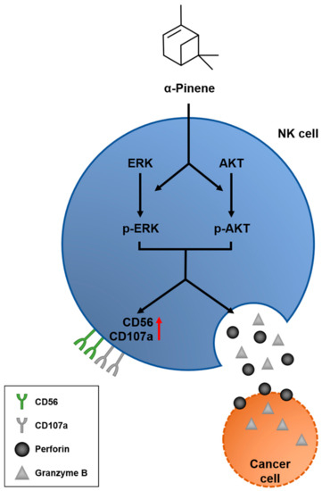 Schematic model of α-pinene promoting an anticancer effect via NK cell activation. α-Pinene stimulates ERK and AKT phosphorylation signaling pathways and leads to NK cell activation, which is confirmed by the increased expression of receptors CD56 and CD170. Consequently, the NK cell product proteins perforin and granzyme B are induced, leading to cancer cell death.