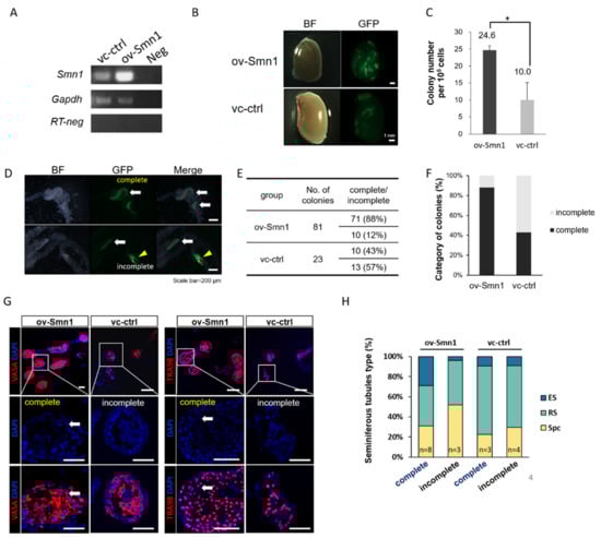 2.2. Overexpression of SMN1 Promotes Self-Renewal and Homing Ability of Mouse SSCs