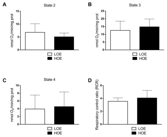 The mitochondrial O2 consumption is similar in both 3D cardiac spheroids differentiated under LOE and HOE conditions. The mitochondrial O2 consumption in 12 days old hPSC-CMs (using hiPSC UEFhfiPS1.4 and UB47 lines) differentiated in LOE and HOE conditions was evaluated using the O2-k oxygraph (Oroboros Instruments). (A) State-2 respiration in hPSC-CMs differentiated under LOE (white bars) and HOE (black bars) conditions. (B) State-3 respiration in hPSC-CMs differentiated under LOE and HOE conditions. (C) State-4 respiration in hPSC-CMs differentiated under LOE and HOE conditions. (D) Respiratory control ratio (RCR) in hPSC-CMs differentiated under LOE and HOE conditions. The number of experiments is 3 independent biological replicates for each bar graph. Data are presented as mean ± SEM. Significance was calculated by Mann-Whitney test.