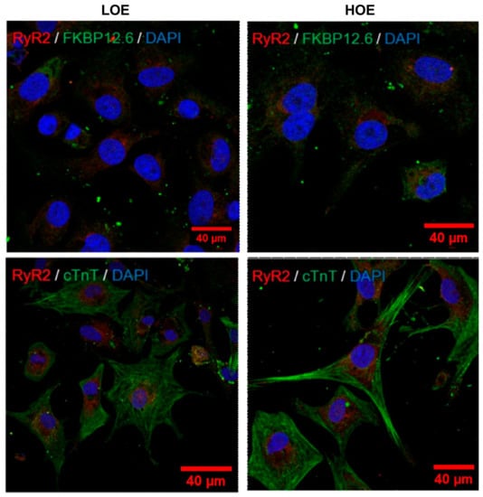 We evaluated the expression and pattern of a major cardiac protein composing the sarcomeres (cTnT) and the main actor of the intracellular release of Ca2+ and its stabilizing partner (ryanodine receptor type 2 or RyR2 and FK506 binding protein or FKBP12.6, respectively) using immunocytochemistry. In both conditions, we found a striated sarcomeric pattern of cTnT and a scattered expression of RyR2 and FKBP12.6 (Figure 4).