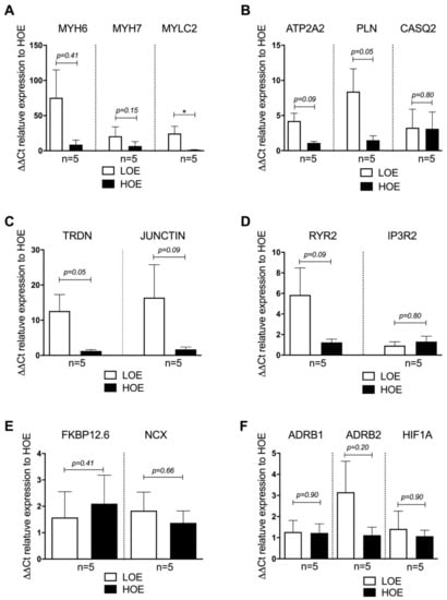 In order to further assess whether the oxygen exposure modulates the cardiac gene expression in 3D spheroids at late stage (i.e., 25-day-old EBs), we performed qRT-PCR experiments. Relative expression analysis indicated high variability in any tested gene. We observed a higher expression of myosin light chain 2 (MYLC2) under LOE and compared to HOE (ratio of 24.53 ± 10.33 for LOE vs. 1.30 ± 0.31 for HOE, p < 0.05) (Figure 5A). A tendency to a higher expression of typical cardiac markers in hPSC-CMs differentiated in LOE compared to hPSC-CMs differentiated in HOE was also observed, including the RYR2 gene (ratio of 5.85 ± 2.63 for LOE vs. 1.23 ± 0.31 for HOE, p = 0.09), ATPase sarcoplasmic/endoplasmic reticulum Ca2+ Transporting 2 (ATP2A2) (ratio of 1.53 ± 0.97 for LOE vs. 1.09 ± 0.21 for HOE, p = 0.09), triadin (TRDN) (ratio of 12.62 ± 4.65 for LOE vs. 1.23 ± 0.37 for HOE, p = 0.05) and sodium/calcium exchanger (NCX) (Figure 5B–E). The expressions of the β1 adrenergic receptor (ADRB1) and β2 (ADRB2) were similar between LOE and HOE, as well as the hypoxia-inducible factor 1 alpha (HIF1A) (Figure 5F). To make sure that the reference gene was not affected by the oxygen exposure, we next evaluated the expression of these same genes using another reference gene, namely Ribosomal Protein Lateral Stalk Subunit P0 (RPLP0) and obtained the same results (Supplemental Figure S3). It is noteworthy that none of these cardiac genes were expressed in hPSC in LOE and HOE before differentiation (Supplemental Tables S1 and S2).