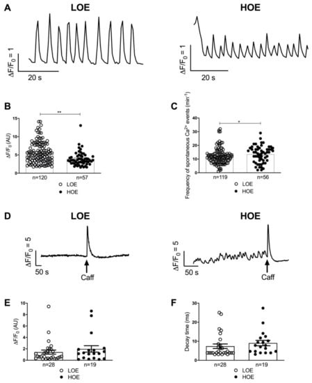 The intracellular Ca2+ cycling is a major component of the cardiac excitation-contraction coupling as the intracellular Ca2+ release precedes and initiates the contraction. To assess the impact of oxygen exposure on the intracellular Ca2+ cycling of the hPSC-CMs, we evaluated some kinetic properties of the intracellular Ca2+ transients in enzymatically dissociated hPSC-CMs from 3D spheroids. Using confocal fluorescent microscopy, we found that 25-day-old hPSC-CMs differentiated under LOE exhibited more regular spontaneous Ca2+ transients associated with significant higher maximal amplitude compared to hPSC-CMs differentiated under HOE (5.65 ± 0.26 AU for LOE vs. 3.89 ± 0.25 AU for HOE, p < 0.01) (Figure 6A,B). Moreover, hPSC-CMs differentiated in LOE exhibited lower spontaneous Ca2+ events (frequency of occurrence of 11.97 ± 0.52 min−1 for LOE vs. 13.48 ± 0.81 min−1 for HOE, p < 0.05) (Figure 6C). We then compared the SR Ca2+ content between LOE ad HOE. Application of high concentration of caffeine (30 mM) induced an exhaustive release of SR Ca2+ through RyR2 which reflected SR Ca2+ content. The release amplitude in response to caffeine (1.42 ± 0.36 AU for LOE vs. 1.98 ± 0.56 AU for HOE, p = 0.55) (Figure 6D,E) and the Ca2+ reuptake remained unchanged between the 2 groups (Figure 6D,F).