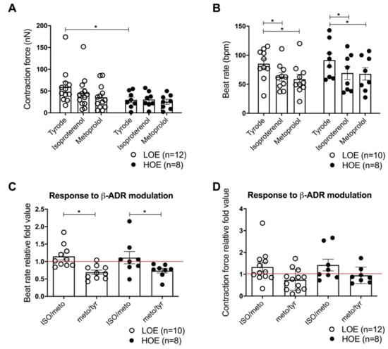 3D cardiac spheroids differentiate under LOE show greater contraction force. Mechanical analysis of contraction force (in nN) and beat rate (in beats/minute, bpm) has been performed using AFM mechanograms in a single position in 3D cardiac spheroids (using hiPSC UEFhfiPS1.4 and hESC CCTL12 lines) differentiated under LOE (white dot plots) and HOE (black dot plots) conditions. (A) Contraction force (nN) in 3D cardiac spheroids differentiated under LOE and HOE conditions. (B) Beat rate (bpm) in 3D cardiac spheroids differentiated under LOE and HOE conditions. (C) Relative analysis of β-adrenergic modulation for beating rate in 3D cardiac spheroids differentiated under LOE and HOE conditions. (D) Relative analysis of β-adrenergic modulation for contraction force in 3D cardiac spheroids differentiated under LOE and HOE conditions. 1 mM of isoproterenol was applied during the AFM experiments to stimulate the β-adrenergic receptors. 70 µM of metoprolol was applied during the AFM experiments to inhibit the β1-adrenergic receptors. The number of experiments varies from 8 to 22 3D cardiac spheroids for each dot plot from 3 independent biological replicates. Data are shown as mean ± SEM. Significance was calculated by Mann-Whitney, Kruskal Wallis and 2-way ANOVA tests. *, p < 0.05.