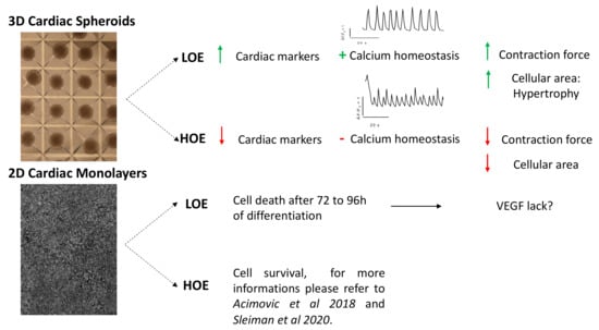 Schematic conclusion representing the main findings. 3D cardiac spheroids differentiated under LOE present a higher expression of cardiac markers, mature Ca2+ homeostasis parameters, higher contraction force and increase of cell area compared to 3D cardiac spheroids differentiated under HOE conditions. 2D cardiac monolayers differentiated under LOE die after 72 to 96 h of differentiation.