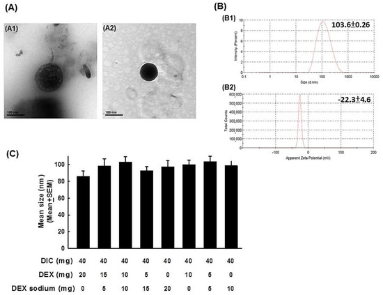 The size and surface charge of DIC- and DEX-loaded liposomes were measured by dynamic light scattering (DLS; Delsa™ Nano Particle Analyzer; Beckman Coulter, Fullerton, CA, USA) and zeta potential (Coulter DELSA 440 SX), respectively. The autocorrelation function of the scattered light was analyzed by the cumulant method as described previously [55].