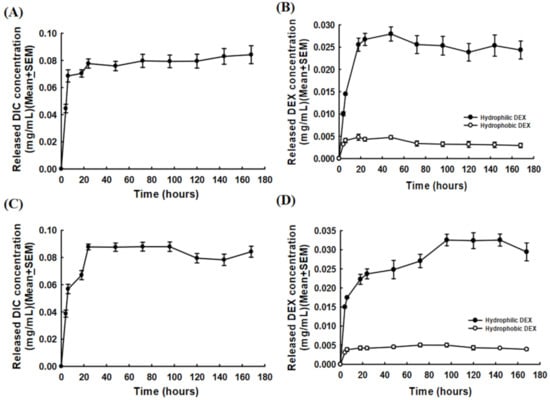 The time–hydrophilic DEX releasing profile from Lipo-DIC/DEX was also measured as described: control, −0.000 ± 0.000 mg/mL; 4 h, 0.010 ± 0.000 mg/mL; 6 h, 0.015 ± 0.000 mg/mL; 18 h, 0.026 ± 0.003 mg/mL; 24 h, 0.027 ± 0.003 mg/mL; 48 h, 0.028 ± 0.003 mg/mL; 72 h, 0.026 ± 0.004 mg/mL; 96 h, 0.025 ± 0.004 mg/mL; 120 h, 0.024 ± 0.003 mg/mL; 144 h, 0.025 ± 0.003 mg/mL; and 168 h, 0.024 ± 0.004 mg/mL (Figure 2B). The hydrophobic DEX-releasing concentration was approximately one-fifth compared to the hydrophilic DEX. The releasing profiles were 4 h: 0.003 ± 0.000 mg/mL; 6 h: 0.004 ± 0.000 mg/mL; 18 h: 0.005 ± 0.001 mg/mL; 24 h: 0.004 ± 0.000 mg/mL; 48 h: 0.005 ± 0.000 mg/mL; 72 h: 0.003 ± 0.001 mg/mL; 96 h: 0.003 ± 0.001 mg/mL; 120 h: 0.003 ± 0.001 mg/mL; 144 h: 0.003 ± 0.001 mg/mL; and 168 h: 0.003 ± 0.001 mg/mL (Figure 2B).
