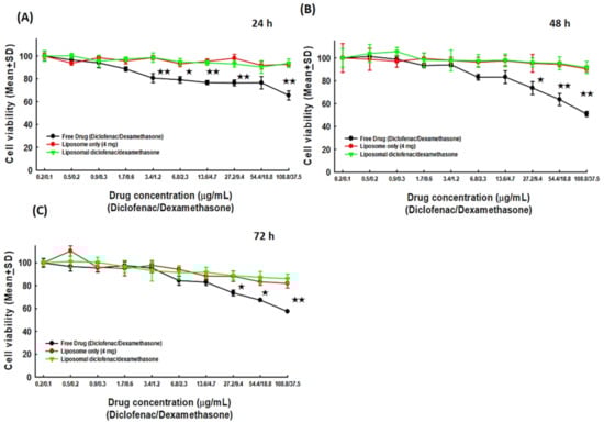 Our previous experiments have revealed the properties of HA-Lipo-DIC/DEX in terms of rapidly generating an effective dose/concentration and sustaining the stable release of DIC/DEX for a long period. We also investigated the biocompatibility of HA-Lipo-DIC/DEX and whether this novel OA therapeutic formulation produced chondrocytes toxicity. Consequently, in the current study, we co-cultured chondrocytes with either free liposome, free DIC combined with hydrophilic/hydrophobic DEX or HA-Lipo-DIC/DEX, and then calibrated the viable cells to analyze the potential toxicity. Cells counts from the co-culture with HA for 24, 48, and 72 h were defined as the control (100%, Figure 3). As shown in Figure 3, the cell survival rate especially in the liposome only (92.74 ± 1.79%) and HA-Lipo-DIC/DEX-treated groups (93.65 ± 3.77%) were significantly higher compared to free DIC combined with the hydrophilic/hydrophobic DEX-treated group (65.48 ± 4.01%, 24 h after 108.8 mg DIC/37.5 mg DEX treatment, Figure 3A). There was no significant difference between liposome only and HA-Lipo-DIC/DEX-treated groups. In addition, the cell survival rate after drug treatment for 48 h and 72 h of the liposome only (48 h: 90.44 ± 2.59%; 72 h: 81.96 ± 4.02%) and HA-Lipo-DIC/DEX-treated groups (48 h: 91.68 ± 5.34; 72 h: 86.03 ± 4.06%) remained superior to the free DIC combined with hydrophilic/hydrophobic DEX-treated group (8 h: 50.98 ± 2.24; 72 h: 57.44 ± 0.15%, Figure 3B,C).
