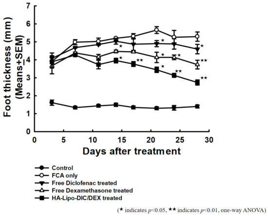 The previous evidence that we have presented of HA-Lipo-DIC/DEX treatment could not induce chondrocytes toxicity, and the long-term drug releasing property could sustain more than seven days. To validate these findings in vivo, we topically administered exogenous free DIC, free DEX, or HA-Lipo-DIC/DEX into sub plantar tissue of the right hind paw of Freund’s Complete Adjuvant (FCA)-treated mice in order to observe the anti-inflammation and relative efficacy of the liposomal nanoparticle formulation. As shown in Figure 4, HA-Lipo-DIC/DEX was revealed more efficacious in inhibiting hind paw thickness than either free DIC or free DEX 14 days after treatment. The paw thickness of each group at day 28 after FCA treatment was as indicated: FCA only, 5.29 ± 0.26 mm; free DIC, 4.60 ± 0.26 mm; free DEX, 3.73 ± 0.24 mm; and HA-Lipo-DIC/DEX, 2.74 ± 0.14 mm, respectively. These results indicate that both free DIC and DEX treatment could inhibit inflammation in vivo; however, HA-Lipo-DIC/DEX could significantly inhibit OA-induced inflammation in comparison with other groups in vivo.