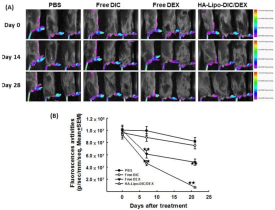 In vivo imaging of systemically administered liposomes. Arthritis was induced in C57BL/6 mice by subcutaneous injection of FCA as described in Materials and Methods. At the time of appearance of signs of arthritis (disease onset), mice were randomized (n = 5 per group) and given intravenously NE680 (1 nmol/25 μL) two injections every 14 days starting from day 7 (indicated by arrows) to monitor the inflammation status. Mice then receiving single-dose treatment from day 8 of the following preparations: FCA only, free DIC, free DEX, or HA-Lipo-DIC/DEX. (A) The fluorescence imaging of arthritic mice receiving various treatments including FCA only, free DIC, free DEX, or HA-Lipo-DIC/DEX after NE680 injection and their distribution in the paw was assessed by Near-infrared fluorescence-imaging. (B) Fluorescence activities of arthritic mice in various treated groups (mean ± SEM). Mice receiving free DEX or HA-Lipo-DIC/DEX exhibited the least fluorescence in the first 2 weeks. Four weeks after mice receiving FCA induced arthritic, the HA-Lipo-DIC/DEX treated group exhibited the least fluorescence imaging (★ indicates p < 0.05, ★★ indicates p < 0.001, one-way ANOVA).