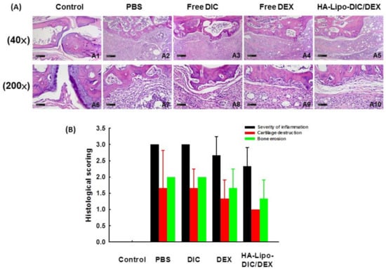 HA-Lipo-DIC/DEX inhibited leukocyte infiltration and cartilage destruction in OA-induced mice. (A) Hematoxylin and eosin staining revealed the histological changes in the various anti-inflammation formulation treatments including control (A1 and A6), phosphate-buffered saline (PBS) (A2 and A7), DIC (A3 and A8), DEX (A4 and A9), and HA-Lipo-DIC/DEX (A5 and A10) on day 28, respectively. (Scale bar (A1~A5) 40×: 200 μm; (A6~A10) 200×: 50 μm). (B) Arthritic changes, including inflammatory cell infiltration, synovial proliferation/enlargement, articular cartilage breakdown, and bone destruction, were evaluated 28 days after administration of Freund’s Complete Adjuvant (CFA), graded from 0 to 3, and summed. Results are presented as the mean ± SD of 3 animals/group.