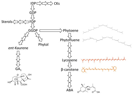 General scheme of pathways leading to production of different hormones. ABA and GAs share their biosynthetic pathway with other hormones, such as CKs. During fruit maturation, balance among hormone biosynthesis changes, and this involves carotenogenesis. IDP, isopentenyl diphosphate; GDP, geranyl diphosphate; FDP, farnesyl diphosphate; GGDP, geranyilgeranyl diphosphate . Number of arrows illustrate number of biosynthetic steps.