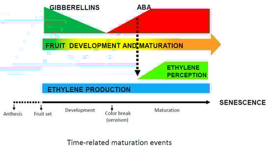Exogenous treatments with ABA may also have an effect in different maturation parameters, although there are some disparities in the response depending on the fruit. For instance, in field-grown grape berries, exogenous ABA increases maturation-related pigments such as anthocyanin and flavonol [21,22,23], advances the process of color change (veraison), and downregulates expression of genes associated with photosynthesis [24]. Interestingly, ABA may exert different actions on maturation and on ethylene biosynthesis depending on the stage of fruit development in grape [25].