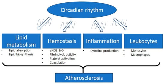 Involvement of the circadian rhythm in atherosclerosis. The intrinsic biological clock has an oscillation cycle of approximately 24 h. The circadian clock controls different physiological parameters of the cardiovascular system such as blood pressure, heart rate, and endothelial function. Circadian disruption is a critical factor leading to atherosclerosis and cardiovascular diseases. Plasma lipid levels are mediated by the balance of lipid absorption and biosynthesis. The lipid plasma levels display circadian oscillations and are independent of food intake. Vascular functions, especially the related endothelial nitric oxide synthase (eNOS) expression and nitric oxide (NO) production, are regulated by the peripheral circadian clock. Many of the important molecules involved in hemostasis have been shown to align with circadian rhythms, including molecules responsible for fibrinolytic activity, platelet activation, and coagulation. Dysregulation of the circadian rhythm leads to inflammation. Proinflammatory cytokines are expressed in a circadian manner. In response to inflammatory stimuli, circulating counts of leukocytes and the function of monocytes/macrophages are modulated by the circadian clock. Therefore, the misalignment of the circadian clock with these parameters could lead to the progression of atherosclerosis.