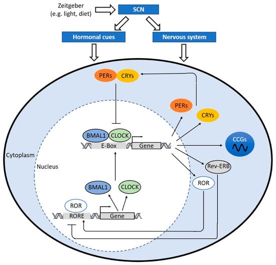 The intrinsic mechanism that responds to the environmental light–dark cycle, is called circadian (derived from Latin “circa diem”, meaning “about a day”). The circadian clock has intimate relationships with many important physiologies and pathways. The intrinsic circadian clock has an approximately 24-h oscillation cycle that responses to abiotic/biotic factors and orchestrates biological processes in adjusting to daily environmental changes [13,14]. The circadian clock components include networks of genes and molecules in the core and peripheral tissues. The intrinsic circadian clock is self-sustaining, through the control of negative feedback loops of the molecular clock. Zeitgeber (German for time-giver) refers to the internal or external factors, which can cue the circadian clock and modulate the circadian rhythm from the molecular to the behavioral level [15,16].