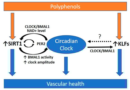 Polyphenols and the circadian rhythm for promoting vascular health. Polyphenols are secondary metabolites of plants, which have been widely studied for their beneficial effects on cardiovascular health. Polyphenols may be beneficial in preventing atherosclerosis via modulating the circadian clock. Polyphenols have been shown to enhance the expression of Krüppel-like factors (KLFs) and Sirtuin 1 (SIRT1), which are highly associated with the circadian clock. SIRT1 and KLFs are important players in protecting against atherosclerosis. SIRT1 interacts with the circadian clock and is required for high-magnitude circadian transcription of circadian clock genes. The circadian clock can regulate SIRT1 activity via the oscillating NAD+ level. The transcription of KLFs is regulated by direct promoter binding of CLOCK:BMAL1. However, whether KLFs have a feedback control to the circadian clock remains unclear (dotted arrow and ?). A functional circadian clock is required for preventing atherosclerosis. PER2, period 2. BMAL1, brain and muscle aryl hydrocarbon receptor nuclear translocator-like protein 1; CLOCK, circadian locomotor output cycles kaput. NAD+, oxidized nicotinamide adenine dinucleotide.