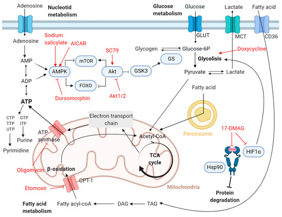Sodium salicylate (CAS N 54-21-7), oligomycin from Streptomyces diastatochromogenes (CAS N 1404-19-9) and doxycycline monohydrate (CAS N 17086-28-1) were purchased from Sigma-Aldrich (St. Louis, MO, USA). 17-DMAG (CAS N150270-08-9) was purchased from Tebu-bio (Barcelona, Spain). AICAR (CAS N 2627-69-2), Akti-1/2 (CAS N 612847-09-3), dorsomorphin dihydrochloride (CAS N 1219168-18-9), SC79 (CAS N 305834-79-1), and (R)-(+)-etomoxir sodium salt (CAS N 828934-41-4) were purchased from TOCRIS (Bristol, UK).