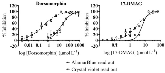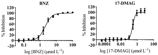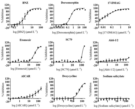 Upon evaluating the nine compounds in at least three independent experiments, six of them were found to be inactive against the parasite (AICAR, SC79, Akti-1/2, etomoxir, sodium salicylate, and doxycycline; Table S1). In contrast, dorsomorphin, oligomycin, and 17-DMAG showed a T. cruzi growth inhibition activity more potent than that of the reference drug BNZ (Figure 2 and Figure S2). Respectively, dorsomorphin, oligomycin, and 17-DMAG yielded average IC50 values of 0.24 (0.021) µmol L−1, 0.52 (0.047) µmol L−1, and 0.017 (0.001) µmol L−1 (Table 1).