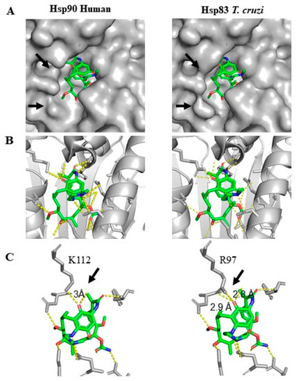 Binding of 17-DMAG to Human Hsp90 and T. cruzi Hsp83. (A) Binding pocket surface of Hsp90 (left) and Hsp83 (right) with 17-DMAG. (B) Zoom-in to the residue interactions of Hsp90 (left) and Hsp83 (right) with 17-DMAG. (C) Zoom-in to the K112 residue of Hsp90 (left) and R97 residue of Hsp83 (right) interaction with 17-DMAG. PyMol software was used for visualizing PDB ref.: 1OSF [32]. 17-DMAG structure is represented in green and protein structure in grey. In panel A, arrows indicate morphological differences between both surfaces. In panel C, arrows show the position of expected H-bonds between 17-DMAG and K112 or R97 residues, respectively. Hsp90/83 from panel B is represented as cartoons; in panel C they are represented as sticks [33].
