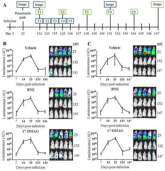 Ultimately, antiparasitic activity of 17-DMAG was assessed in an in vivo model of chronic T. cruzi infection with a transgenic parasite expressing luciferase (Brazil strain, DTU I) [35,36]. In this assay, the signal provided by luciferase after injection of its substrate in the animals is proportional to the T. cruzi load, and it is considered a surrogate for parasitemia. Infected mice reached the peak of parasitemia at day 23 and treatment started at day 132 once chronic infection had been established (Figure 6A). One experimental group was treated intraperitoneally with 30 mg/kg/day of 17-DMAG for five days (Figure 6A,B), while other was treated five times every three days (over a 15 days period) with same dose (Figure 6A,C). We used these dosage and regimes following previous works by Meyer and coworkers and Santos and coworkers, respectively [37,38]. Vehicle-treated and BNZ-treated groups (same regimes and dose: 30 mg/kg/day) were included as controls. None of the groups treated with 17-DMAG showed statistically significant differences versus either vehicle or BNZ groups. Similarly, no statistically significant differences in the registered luciferase signal were observed between daily or intermittently treated mice, either with 17-DMAG or BNZ (data not shown). After treatment, mice treated daily and those treated intermittently with 17-DMAG, respectively had mean luminescence values (AU) of 1.95 × 106 (±5.60 × 105) and 8.69 × 106 (±1.27 × 107) photons s−1. Such values were higher than the 5 × 105 photons s−1 threshold indicative of parasite clearance that had been determined by imaging a noninfected mouse injected with luciferase substrate the same as infected [39].
