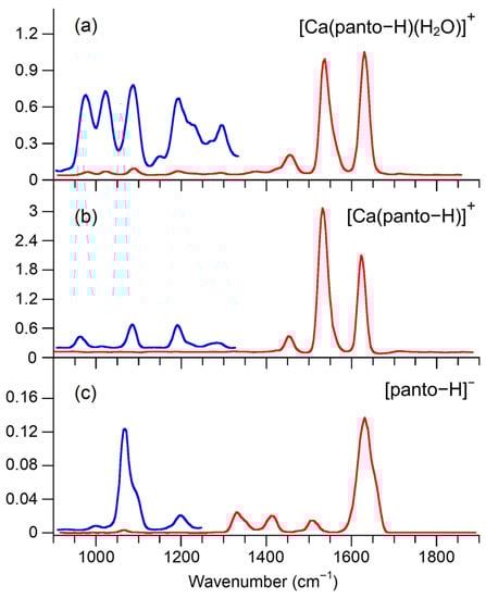Experimental infrared multiple photon dissociation (IRMPD) spectra of: (c) deprotonated pantothenic acid [panto-H]− when the ions are submitted either to 500 ms of free electron laser (FEL) light (blue profile) or to 120 ms using one attenuator (red profile); (b) pantothenate calcium complex [Ca(panto-H)]+ irradiated with either 1 s of FEL light (blue profile) or with 500 ms using one attenuator (red profile); (a) and its monohydrated form [Ca(panto-H)(H2O)]+ with 500 ms of FEL light and one attenuator (blue profile) or with 250 ms and three attenuators (red profile).