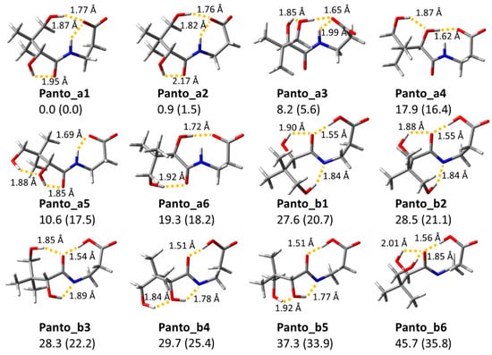 A comprehensive presentation of amide deprotonated conformers, all found notably less stable than Panto_a1, is reported in Figure S6. Interestingly, relative to Panto_b1, a mismatched arrangement of the alcoholic hydroxyl groups destabilizes Panto_b3 by only 0.7 (1.6) kJ mol−1, while the complete lack of hydrogen bonds involving the deprotonated amide in Panto_b6 causes a drop in stability of 18.1 (15.2) kJ mol−1.
