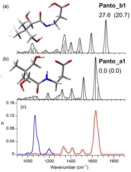 In agreement with its unfavorable energetic prediction, the calculated spectrum of Panto_b1 does not agree with the experiment, disproving its presence in the assayed population. In fact, the most diagnostic bands due to stretches of the carboxylic C1 = O1 and the amide C1′ = O1′ carbonyl groups, which are predicted at 1722 and 1597 cm−1, respectively, are barely observed in the IRMPD spectrum (Figure 3).