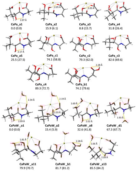 Overall, the same stability order is found by employing both B3LYP(-D3) and MP2, with the ground state conformer CaPa_a1 stabilized by a tetradentate interaction with the oxygens of carboxylate (O1a, O1b), carbonyl (O1′), and primary alcoholic (O4′) groups, along with an HN…O2′H (rHN…HO2′ = 2.075 Å) hydrogen bond. Only in the case of the pentadentate CaPa_a3 and CaPa_a2 does a modest change in the energy values cause a switch in the energy ordering, with the latter conformer located at 6.1 kJ mol−1 above CaPa_a1 at single point MP2 calculations (Figure 4 and Table S3).
