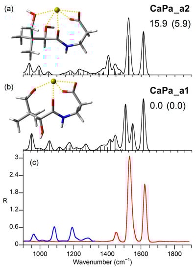 In addition, the IRMPD band at 1450 cm−1 encompasses the CH2 scissoring, CH3 umbrella, and C1C2 and symmetric carboxylate stretches, predicted at 1417 cm−1 (CaPa_a1) and 1405 cm−1 (CaPa_a2), together with O2′H bend (CaPa_a1), and C3H2 scissoring (CaPa_a1), calculated at 1445 and 1441 cm−1, respectively. Finally, the weaker peaks at 1285, 1192, 1085, and 965 cm−1 are due to contributions by CaPa_a1, with NH bend and CH bends at 1271 cm−1; O2′H bend and C2H2 twist at 1178 cm−1; C2′O2′ stretch and CH2 rock at 1056 cm−1; C4′O4′ coupled with a C2′O2′ stretch at 950 cm−1, and by CaPa_a2, with C4′O4′ coupled with a C2′O2′ stretch and CH3 bending at 937 and 989 cm−1. In summary, no other arrangement fulfills as well the matching with the IRMPD spectrum, thus confirming Ca(II) to prefer CS binding to carboxylate oxygens and anchoring carbonyl and alcoholic hydroxyl units of deprotonated pantothenic acid. A fully oxygenated coordination pattern was also disclosed by X-ray crystallographic analysis of calcium bromide salt of pantothenic acid [63].