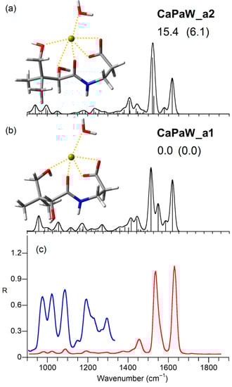The IRMPD spectrum of the monohydrated complex, [Ca(panto-H)(H2O)]+, which closely resembles that of bare [Ca(panto-H)]+, is compared with the calculated IR spectra of the two most stable tetradentate (CaPaW_a1), the global minimum, and pentadentate (CaPaW_a2) structures in Figure 6 and a selection of optimized geometries is reported in Figure 4. Thermodynamic data regarding all the sampled structures are presented in Table S4, while their calculated spectra are shown in Figures S9, S10, and S11. Both geometries, which differ by only 5.9 kJ mol−1, are singly solvated versions of the lowest energy bare adduct, [Ca(panto-H)]+, which is stabilized by extra coordination of calcium ion with an intact water molecule that in turn forms hydrogen bonds to a carboxylate oxygen of pantothenate (rO1−…HO ~ 2.2 Å). This type of solvation is more favorable relative to different skeletal arrangements such as in the following: (i) isomers CaPaW_a8/11 and 13, where a bridging water molecule is simultaneously coordinating Ca(II) ion and forming a hydrogen bond with the primary alcohol O4′H and carbonyl O1′ acceptors; (ii) CaPaW_d1, where the amide NH donor interacts with an external water molecule; (iii) CaPaW_b1, with deprotonated amide nitrogen binding to Ca(II) ion. These structures are found to lie 41.8, 84.2, 67.7, and 81.2 kJ mol−1 higher in energy relative to the lowest energy structure CaPaW_a1, respectively (Figure 4). Moreover, arrangements where a water molecule is placed external to the metal coordination sphere, occurring for example in CaPaW_d1, are less likely and have been hardly observed under our experimental conditions [68]. As a result, any significant contribution of these isomers to a thermally averaged gas-phase population can be ruled out.