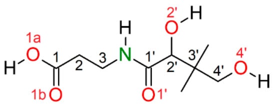 Schematic representation of (R)-pantothenic acid. Annotation for atom numbering is reported.