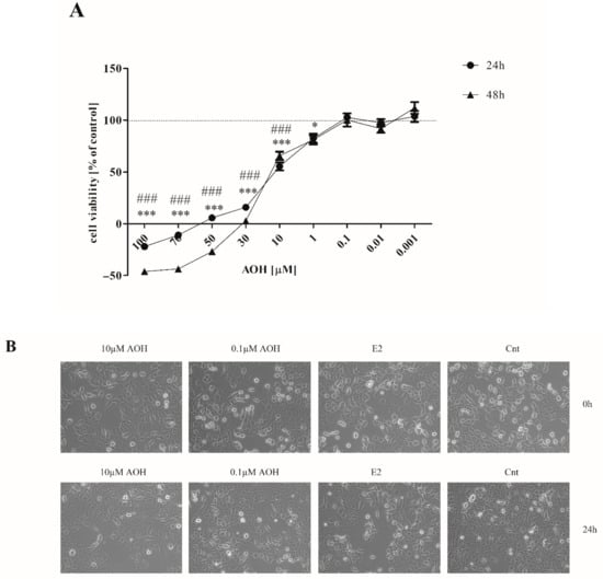 AOH was dissolved in DMSO as stock solution of 0.01 M and freshly dissolved in experimental medium before usage. The concentration of DMSO in the used AOH highest concentration (10 µM) was lower than 0.1% and did not affect cells viability. Thus, for all experiments, cells treated with experimental medium were used as control. E2 in the concentration of 10 nM was used as positive control.