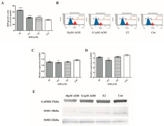 An induction of oxidative stress in cells is reported to be a cause of the exposure to mycotoxins [19]; thus, we evaluated if decreased viability of 184A1 cells is associated with production of ROS in cells. Firstly, we observed a statistically significant increase in the number of ROS positive cell (*** p < 0.001) as compared to the non-treated cells. An almost two-fold increase was observed for 10 µM of AOH; for lower concentration, a similar to estrogen (E2) increase was observed (Figure 2A,B). The increase in the number of ROS positive cells was associated with changes in the expression of genes associated with the response to oxidative stress. A decrease in the SOD-1 expression was observed for both doses of AOH, both at the gene (Figure 2C) and protein level (Figure 2E). A decrease in the expression of SOD-2 was also observed, significant for lower dose of AOH and not significant for higher dose (Figure 2D,E).